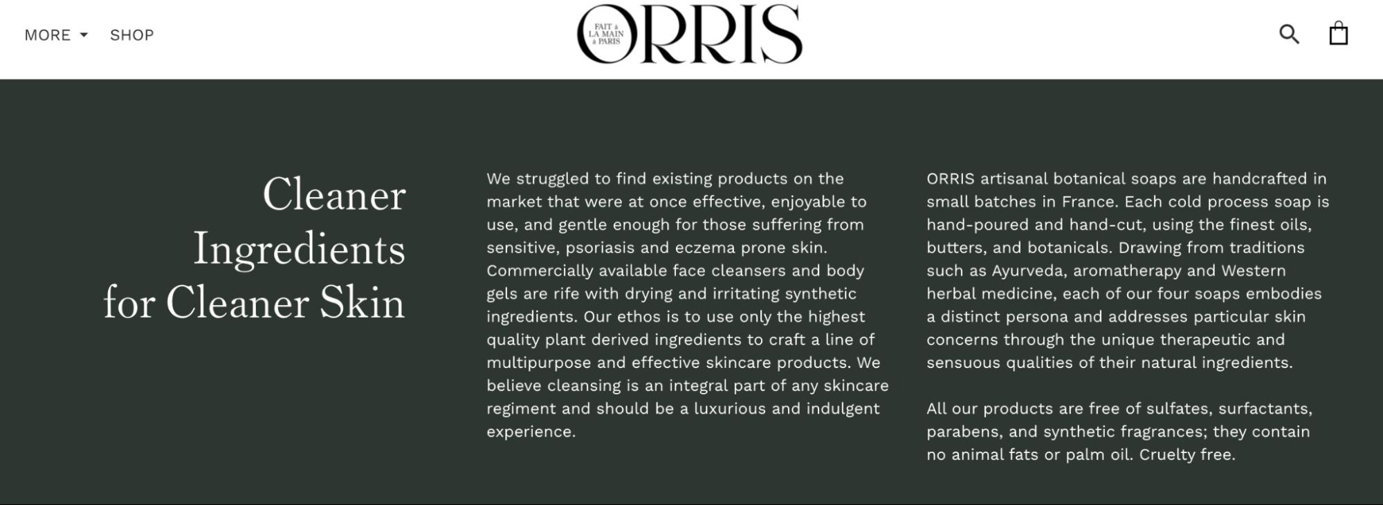 Soap brand ORRIS has a blurb on its About page that could easily be repurposed for the company description section of its business plan.