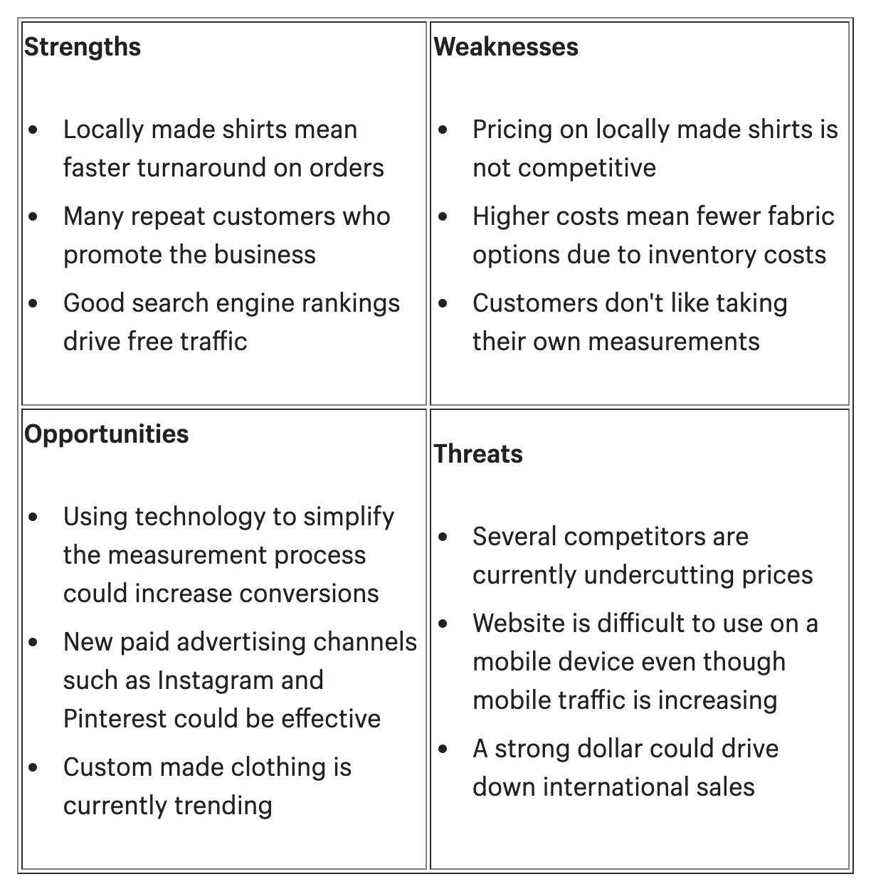 The market analysis consists of research about supply and demand, your target market, industry trends, and the competitive landscape. You might run a SWOT analysis and include that in your business plan. Here’s an example SWOT analysis we did for an online tailored-shirt business: