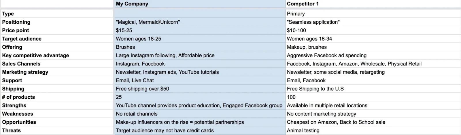 You’ll also want to do a competitive analysis as part of the market research component of your business plan. This will tell you who you’re up against and give you ideas on how to differentiate your brand. Your competitive analysis might look like this: