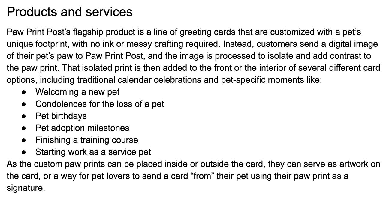 This section of your business plan describes your offerings—which products and services do you sell to your customers? Here’s what we wrote for Paw Print Post: