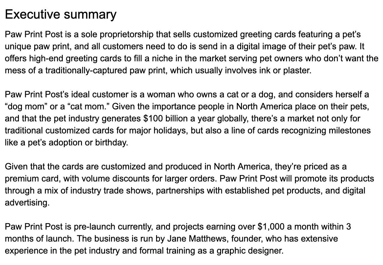 In our business plan template for Paw Print Post, the executive summary is four paragraphs and takes a little over half a page: